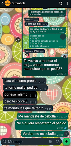 Read moreSon riquísimas pero el/la que atiende a la noche no lee bien, siempre tenemos algún problema con el pedido! O manda lo q se le canta sin preguntar o la cantidad que quiere... Recién me pasó de pedirle UNA DOCENA y me mandaron/cobraron 8 y obvio de las q le pedí me mando el gusto q se le cantó (ejemplo pedí carne cortada a cuchillo y mando carne comun... eso es lo de menos, lo peor fue q mando cebolla y pedí verdura! Casi le pega!) ... Subo fotos del chat p q se vea el...