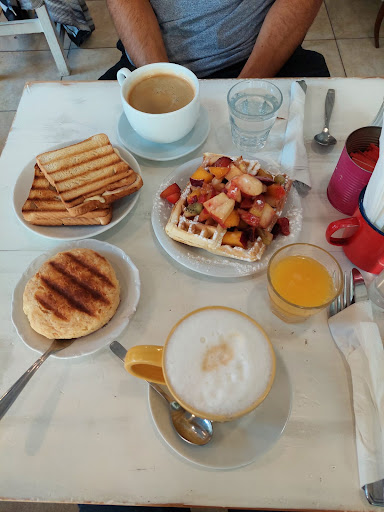 ☕Qué pedimos: Combo tostado de jamón y queso + infusión. Combo waffles con fruta + infusión + exprimido. Agregamos un scon de queso.