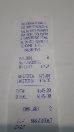 Read moreLa Confitería Nuria es un verdadero clásico de Rosario, un lugar que ha sido parte de la tradición local durante años. Con su ambiente cálido y acogedor, es el sitio perfecto para disfrutar de una excelente merienda, con una variedad de pasteles, tortas y dulces irresistibles. Además, su café es de lo mejor, complementando perfectamente cualquier elección del menú. Nuria es el lugar ideal para quienes buscan revivir un momento nostálgico o simplemente disfrutar de un buen café y postres en el corazón...