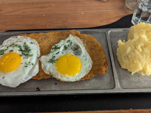 Para el plato principal, cada uno eligió su milanesa: ella se fue por la a caballo y yo por la de 4 quesos. Las milanesas estaban buenísimas, pero lo que más nos sorprendió fue lo tierna que estaba la carne. Literalmente se deshacía, como si fuera manteca. La mía, con el topping de 4 quesos, estaba perfecta: suave, y el sabor de los quesos se sentía de maravilla. El puré que acompañaba también estaba casero y buenísimo.