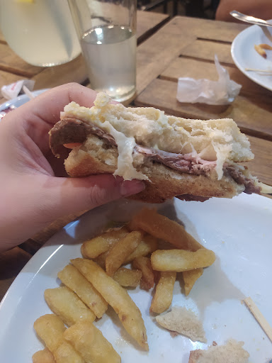 Read moreRico el lomito con jyq y papas. Nos super llenamos. Cosas para corregir el lomo tenía mayonesa y en ningún lado lo aclara también tenía papas y tampoco lo aclara yo lo supe porque pregunté. Cuando llegamos nadie nos recibió, varias veces frenamos al mozo para preguntar x una mesa pero nos decía ahi vuelvo. Pasaba por al lado y no frenaba. Estaban todas las mesas ocupadas pero afuera había fácil 5 mesas de 4 personas con dos personas es decir era tan simple como separar las mesas pero aún así tuvimos que esperar a q se desocupara alguna, cuando se desocupo tuve que frenar al mozo y preguntarle si nos podríamos sentar nos dijo que si y ahí nos sentamos. Demoraron mucho en atendernos y en traernos la cuenta y cobrarnos. Podrían mejorar mínimo la atención de los que esperamos por una mesa y el tema de las especificaciones en la comida pq si mi novio fuera alérgico a la mayonesa sería otra...