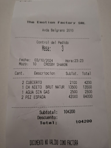 Read moreAlmuerzo del 15 de octubre 2021. Entrada: rabas con aceite inaceptable para lo que presume el lugar. Presencia de partículas de harina calcinada. Rebozado húmedo y brillante; esto es, exceso de aceite (En cuanto al motivo, lo sabrá el cocicero, o cualquier mortal que agarró alguna vez una olla: baja temperatura del aceite para la fritura). Plato principal: en carta: ossobuco con arroz amarillo y gremolata cítrica; en la presentación (en la realidad): un poco de arroz Gallo (que no se pega) de color amarillo, y unos ´cachos´ de nervio y hueso, y un poquitín de carne que había que esmerarse para su extracción; junto con unos ´trocitos´ de verduras indescifrables. En sabor: a nada, aunque de a ratitos, aparecía un intenso ´cítrico´ desconcertante. Postre: vocán de chocolate. Ínfima bocha de americana, un timbal de chocolate a diez centímetros, y una frutilla entera (sí; con sépalo y pedículo) a otros diez centímetros. En sabor: correcto al principio, hasta que se empieza a notar la harina de la masa que empieza a dominar por sobre la salsa que la contiene. Demora: una hora y veinte minutos desde el pedido del plato principal hasta su arribo. Si con el tiempo de espera, amainan las ansias por el comer; al primer bocado,...