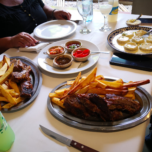 Read moreFuimos con nuestro perrito y pudimos ingresar al patio, el clima no estaba muy ameno, pero por suerte no hacía tanto frío. Si el día no acompaña, no recomendaría estar afuera... Considerar eso si vas con tu mascota, porque adentro no se puede entrar con ella. Afuera es un espacio pequeño, tener en cuenta eso también, por ahí si ya está ocupado el patio, no vas a tener suerte. Aparentemente el salón tenía algunas reservas, así que quizá se pueda reservar con antelación. La comida muy rica y bastante abundante para lo que solemos comer nosotros... Pedimos de entrada unos langostinos porque los principales iban a demorar y al final no demoraron tanto. Si no van con mucho hambre, con los platos principales quizá sea suficiente... Pedimos pescados (a la leña): salmón rosado y pacú, con bombas de papas y vegetales asados (mención especial para esos vegetales, pocas veces me pasa que pido y estén tan ricos, abundante cantidad y variados, realmente un lujo!) Me sobró de mi plato y me ofrecieron envolver para llevar, me pareció adecuado para no desperdiciar. Buena atención, súper amables nuestras mozas. El valor de los platos no es de los más económicos, pero cumple precio-calidad. No es el típico restaurante bodegón de campo, es más bien un restaurante...