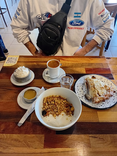 Hola a todos, volví a las reseñas. En este caso entré a esta cafetería a la que había ido con anterioridad (aproximadamente hace 2 años), donde pedí un arrollado de manzana que me había parecido bastante malo, más similar a una factura que a lo que debería ser. Con la esperanza de que haya cambiado, pedí una tarta de manzana y un café negro. Esta tarta, siento que es el mejor medidor para determinar la calidad de la pastelería del lugar, ya que lograr las texturas y los sabores de esta receta no es fácil. Para mi sorpresa, se me permitió agregarle crema (algo que siento que debería estar estandarizado, ya que genera un buen contraste con el ácido de la manzana y la crocantez de la masa) lo cual es de agradecer. En fin, todo muy bien realizado; la manzana bien cocida, el crocante de la masa estaba muy bien, buena cantidad de canela... En resumen; una receta ejecutada a consciencia. El café estuvo correcto y para nada quemado (algo difícil de conseguir en la mayoría de cafeterías) y el detalle del chocolatín acompañando la bebida caliente es valorable. Los mozos, por otro lado, muy atentos. A pesar de la cantidad de gente fuimos atendidos a la brevedad y se nos sirvió a menos de 20 minutos de levantada la orden. Gran cafetería para visitar y, de mantenerse esta línea, un futuro clásico...