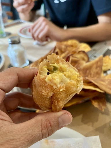 Fuimos a cenar y pedimos Batatas fritas excelentes. Nachos, un bowl que alcanzo y sobro (eramos 8) Empanadas fritas casirisimas... excelentes 👌! Pizza de rucula y jamón crudo, cebolla caramelizada y 4 quesos. La.masa casera bien tostada y finita.. si no hubiésemos pedido las.entradas pedimos 2 o 3 pizzas más.
