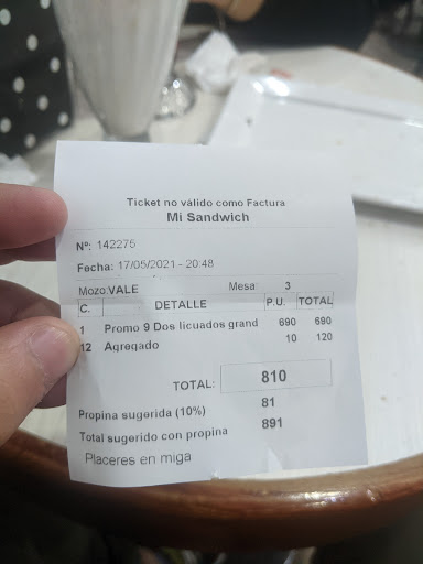 Muy buena atención; los sandwichs muy ricos, no bajen la cslidad,ni suban precios, son accesibles y dan buena competencia así. Las confiterías es lo q deben hacer ofrecer calidad y competencia en precios, a simple vista, se vé todo higiénico. El baño también,el cual,siempre, si es un buen lugar debe siempre estar limpio y no faltarle ningún implemento. Muy recomendable. Bueno han subido un poco los precios, pero accesible, ahora Mi Sandwich de Avda. Ig.De La Roza, muy caro todo, más q casa central y lod sandwich mucho más chicos, prefiero la primera casa matriz y no sucursal, es que NO SE DAN CUENTA... que no sin competencia con ningún otro local ni en cantidad, calidad y precios, van a ir en baja así, en baha de clientes, sean como casa matriz de Riv y Entre Rios. Entra la impirtación, y ván a empezar a perder, cuidado, sepan administrar los negocios. Y no estar cambiando mozos, eso dá mal aspecto, p/el cliente...