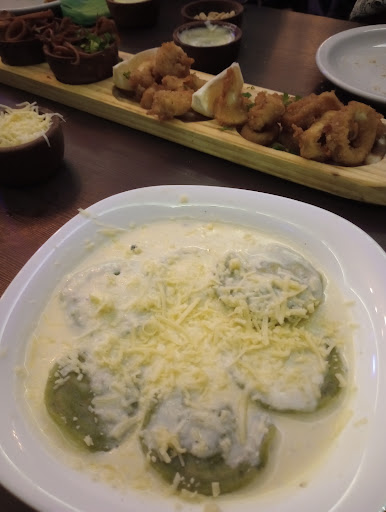 No me gustó la comida, pedimos una tabla rústica que tenía pinchos de lomo, pinchos de cerdo, pinchos de pollo y pinchos de langostinos, además rabas y rodajas de salchichas envueltas en panceta y además una porción de papas con Cheddar y panceta que estaban ricas. Nada tenía sal, cualquier cocinero sabe que no es lo mismo ponerle sal a la comida una vez hecha, que sazonar durante la cocción. Los pinchos de pollo no existían, los remplazaron por dos más de carne, igualmente dura e insulsa además de estar como hervida previamente. Lo único rescatable fueron las rabas ya que al ponerles limón quedan sabrosas. Evidentemente hay mucha gente que disfruta de esa comida porque el local estaba absolutamente lleno lo que lo convertía en un lugar donde tenía que casi gritar para escuchar a mis compañeros de mesa. Rescato a la chica que nos atendió, no recuerdo su nombre, pero fue muy amable y sabe cómo tratar a...