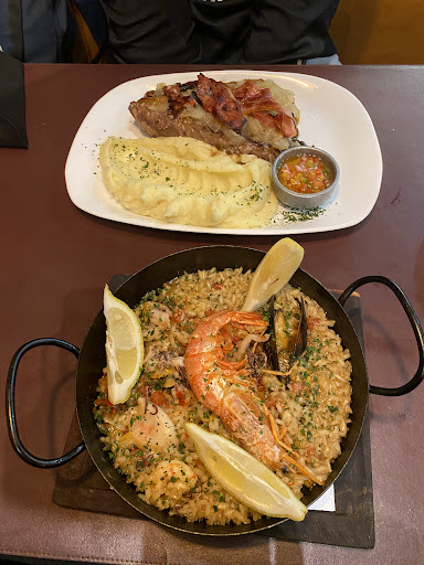 Con respecto a la comida, pedimos un bife de chorizo con cebollas y panceta por encima, el mismo lo pedimos a punto, tirando a rosa, y lo acompañamos con puré de papas. Cuando recibimos el plato, lo cortamos y estaba crudo. Un punto mucho menor al que habíamos pedido. Al ver esto solicitamos que la cocinen un poco más. Nos retiraron el plato y en el mientras tanto fuimos probando la paella. Estuvo muy rica pero encontramos un pelo en ella, lo cual me sacó las ganas de seguir comiendo. Al rato que llevamos esperando, trajeron el bife de chorizo, al mismo le faltaba la cebolla y la panceta, ademas de que la carne era distinta y vino menos puré, además de venirnos sin la salsa criolla del principio. Le comentamos al hombre que nos atendió y se limitó a traer la cebolla y la panceta en un platito ya habiendo terminado de comer la carne, carne que tenía mucha más grasa comparada con la anterior. Dejo adjunta la foto que sacamos del primer plato. Así debía haber sido entregado. Pero consideren que faltaban los ingredientes encima de la carne, la cantidad del puré no era la misma, y la salsa criolla no fue entregada...