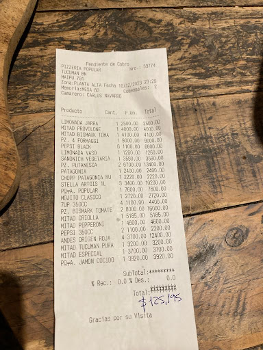 Read moreLa atención de los camareros es un poco caótica, esto no quiere decir q los chicos atiendan mal, ellos tienen muy buena onda y simpatía y predisposición, no tengo quejas hacia ellos q de hecho les dejamos una muy buena propina por su amable atención, el problema es que son muy pocos empleados para semejante cantidad de comensales, creo q quedó clara mi explicación. Le doy 3 estrellas porque las pizzas son muy flojas en ingredientes y sabor, la masa es demasiado finita para mi gusto, los bordes son tan secos como un cartón, pedí una pizza con anchoas y tuve q devolverla para que le pongan anchoas porque solo tenia un dejo de sabor a ellas, a lo que la camarera accedió muy amablemente a solucionarme el problema y ahí si ya parecía una pizza con anchoas. Sr dueño o gerente de PIZZERIA POPULAR, sus productos no son para nada económicos como para que no ponga adecuadamente los ingredientes que prometen, que si bien es cierto al haberme quejado lo solucionaron, creo que por los precios, ubicación y cantidad de comensales que van a gastar su dinero en su negocio, no debería permitir que un cliente tenga que devolver el producto para que le pongan la cantidad adecuada de ingredientes. La verdad, no volvería a este lugar, a menos que cambien su conducta un tanto avara y que den otra opción de masa, que porque a mi no me guste, no quiere decir que sea fea, seguramente habrá gente a la que le guste así, pero por lo menos a mi no. Quiero recalcar que la atención por parte de los camareros podría mejorar agregando aunque sea uno o dos más personas, pero le ponen toda la...