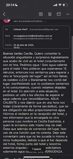 Quiero comentar la situación angustiante y sorpresiva ingratamente que acabo de vivir en el hotel conjuntamente con mi hna. Pedimos agua ! Solo agua caliente para el mate ! Nos pidieron que esperamos 15 minutos, entonces nos sentamos para esperar y vino la “encargada del lugar” así se hizo llamar, de nombre LUCIA y literalmente nos corrió del lugar, manifestando que no podíamos sentarnos si no consumíamos, cuando estamos alojadas en el hotel. En atención a esta situación, pedimos un café a los efectos de esperar el agua caliente que necesitábamos. AGUA CALIENTE y nos dijeron que en una hora nos traían (claramente de forma sarcástica), que no era obligación de ellos proporcionarnos agua. Hicimos el reclamo en la recepción del hotel, y nos informaron que la encargada es otra persona cuyo nombre es Cecilia Espíndola, a quien le enviamos este mismo msj vía mail. Ósea que además de corrernos del lugar, hizo uso de una función que no ostenta. Dejo este comentario para que no les suceda lo mismo a otros huéspedes, debido a que el bar depende del hotel, forma parte del hotel y nosotros estamos alojadas en el hotel y solicitamos solamente agua caliente. Una VERGÜENZA. Adjunto el Mail enviado. Esperando mínimamente unas disculpas. Mínimamente. Tomaremos las medidas pertinentes como abogadas que somos porque estamos en presencia de una violacion a un principio constitucional fundamental y amparado en la ley de defensa al consumidor y usuario, que es el trato digno y equitativo ! (Art. 8 bis LDC) (art.52 bis) Buenas tardes ! Nobleza obliga quiero dejar asentado que Cecilia, encargada del lugar se contactó conmigo, me brindó su núm de teléfono, ofreció unas disculpas, tomó medidas al respecto y además nos brindó menú sin costos mi familia y quien suscribe ! Me alegra mucho saber que haya personas que consideran importante y esencial lo manifestado por el cliente; el trato, brindando solución al respecto ! Roberto nos atendió en la mesa en el día de...