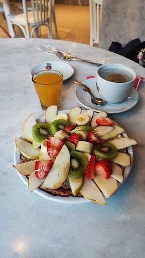 En principio vino con un solo panqueque, la presentación bien, mucha fruta... Pero creo que estuvo errado que le colocaran la miel encima de la fruta, (que ya de por sí estaban muy dulces),y que no se lo pusieran directamente al panqueque. Quedó raro, no sabía del todo bien. Si hubiera querido una masa más bien salada hubiera pedido tostadas o algo similar, no un panqueque que dice ser con miel, de última lo hubieran puesto en la mezcla. Hasta poder comer una parte del panqueque que estuviera dulce tardé un buen rato.