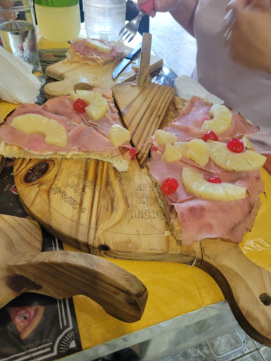 A veces nos fijamos en el aspecto del local, las instalaciones, la decoración, y nos sentamos a comer algo, y luego la comida decepciona, o no lo hace pero la cuenta viene sumamente abultada. Acá sucede todo lo contrario. Vine por las buenas recomendaciones, de afuera tiene pinta de bodegón de barrio. Claro que la magia te espera adentro. Unas pizzas sumamente ricas, muy originales. Pedimos de jamón y muzzarella, la mitad de esta con borde relleno de salchicha y mostaza. Muy rica! Y una de jamón y ananá, que para nuestra sorpresa traía guindas en cada porción! Masa alta y bordes culones. Todo se sirve en platos de madera. La mejor atención que puedas tener, esa de pueblo, hospitalaria. Nos trajimos empanadas de fatay a Buenos Aires. Los precios otro tema, las pizzas las caras salen $11.000, cuando por acá ese precio arranca la...