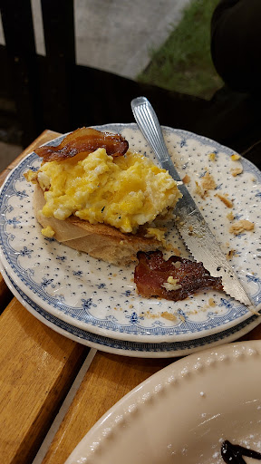 Luego, los tostados con huevos revueltos y panceta vinieron con el huevo demasiado crudo y la panceta muy quemada. No se podía disfrutar del sabor.