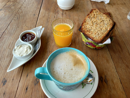 Read moreUn espacio agradable para desayunar o merendar. Tienen un patio trasero acondicionado con grandes detalles. El desayuno que pedí fue básico pero no por eso menos interesante. Un café con leche acompañado de 3 tostadas de pan integral con semillas que ellos mismos preparan y que, dejenme decirles, es riquisimo!!! El dulce casero también roba protagonismo, excelente calidad y para nada dulce. La ensalada fue otro acierto, saciadora y liviana. Me hubiera gustado que me brindaran condimentos ya que era para llevar, por ahí estaría bueno que tengan en cuenta eso. También pedí una porción de brownie de algarrobo con ddl y frutos rojos, una bomba! La única observación que haría es que no descuiden la limpieza, tanto del patio, sus mesas y las plantas! Si están en San Pedro, no olvides darse una vuelta y ver todas las opciones caseras y saludables que tienen...