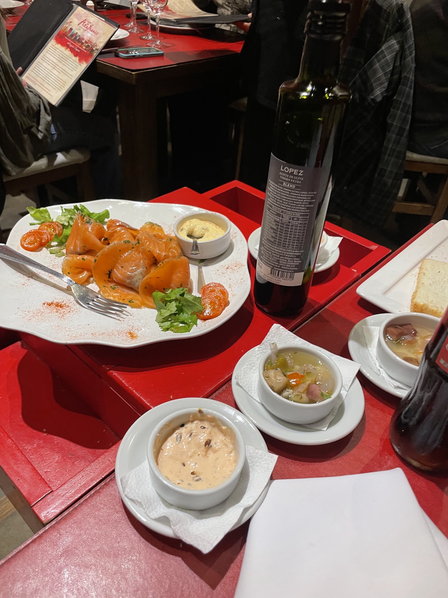 Nos pedimos de entrada salmón curado a las finas hierbas, En el plato principal yo me pedí una cazuela de mariscos, (plato del día los miércoles), de postre una terrina de chocolate y moras, más bebida (3 coca-cola chicas)..