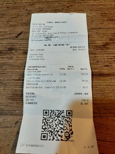 Read moreExcelente lugar , la primera vez que voy desde que abrió, siempre comía comida china de este lugar , antes funcionaba un local de comida china muy conocido en la zona que tenía muchos años en este mismo local , quedó hermoso el local de Café Martinez !!!!! Me pedí un Latte y un alfajor , el café que me preparo Sabrina es uno de los mejores cafés que tomé, va mi felicitación por el café para SANRINA !!!! muchas gracias Sabrina !!!!! Me atendieron muy bien , tanto el chico que me atendió en la meza como la encargada y Sabrina , todos super amables y con muy buena onda, la verdad que da gusto venir así a este lugar , les recomiendo ampliamente el lugar !!!! A , casi me olvido , el alfajor es marca Café Martinez , me sorprendió lo rico que es , parece un Cachafaz y te diría que hasta más rico también !!!!! La verdad que mejor no podía...