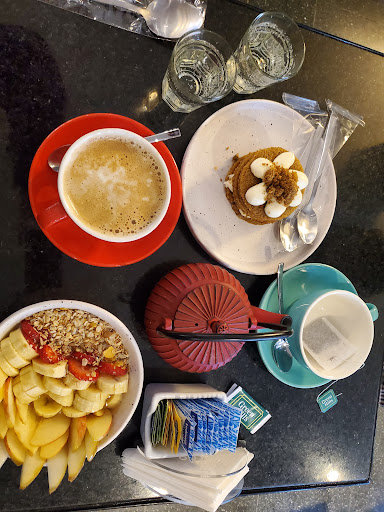 Read moreTiene un montón de propuestas de merienda. Incluso algunas compartidas y de brunch. Tiene varias porciones de mini cakes y varios artículos de panadería. El café está bien y las teteras del té tmb. Los precios también son muy buenos y la estética del local está bien. Tiene un rooftop que no usamos porque llovía. Los baños son unisex, excelente! Pedimos un bowl de frutas, yogurt y granola que tenía una buena variedad de frutas y estaba muy rico. Un café con leche y un té. Adicionamos una mini torta carrot cake que estaba muy rica. A gusto personal le faltaban más frutas secas y pasas pero estaba bien especiada y con un rico frosting. No banco que cada uno de los cubiertos que traen estén dentro de bolsitas plásticas. Se podría prescindir de eso. Volveré a...