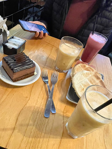 Bueno, llegamos mi novio y yo y empezamos a ordenar por las bebidas, había pedido un capuccino italiano y mi novio un licuado de banana, la chica dijo que tal vez no lo tendrían, se fue a fijar, después de un rato volvió dijo que no tenía ninguna de las dos bebidas, ordenamos dos smooths pero ella no termino de tomar la orden así que tuve que ir yo a pedir al mostrador, después ella volvió y dijo que pasó algo con a licuadora e ordenamos un capuccino normal y un exprimido de naranja, por fin cuando llego el pedido trajo los dos smooths. La verdad que la atención fue un poco descuidada. La parte buena es que la torta estaba genial y la comida estaba buena. El ambiente tenía...