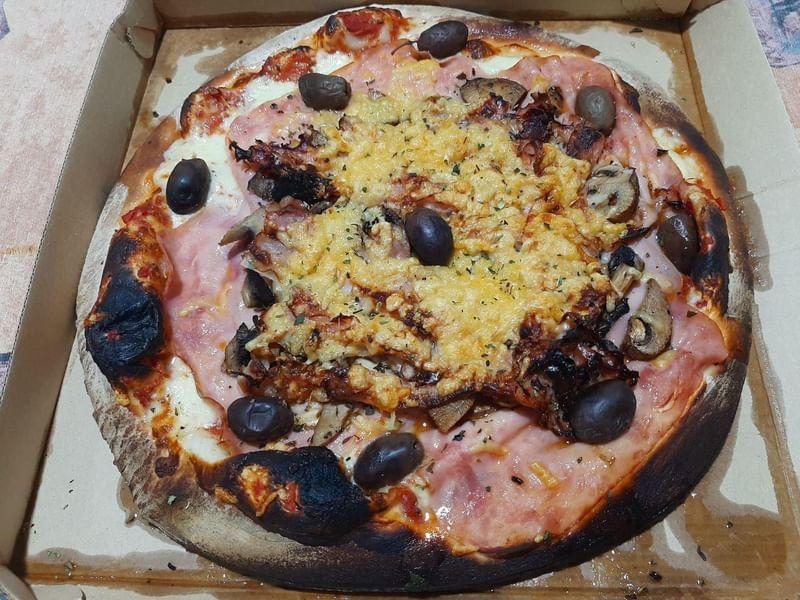 "Muy buenas pizzas!" De las muyyyyy finitas, pero con todo arriba ... Compré media común y media con hongos a 1000 pesos. La sacaron en 12 minutos, mucha gente comiendo en las mesas cuando fui. Hay unas 10 personas trabajando a full. Los cocineros controlan los pedidos por pantallas de televisor LED que le va a asignando una chica -muy amable- que en un mostrador aparte del principal te toma el pedido y te cobra. Ya en la parte de retirar y justo antes de mostrarte la pizza para entregártela otra chica te pregunta si querés aceitunas verdes , negras o ambas y si también querés ponerle orégano. (Es un detalle mínimo.. pero unos guantes descartables no le vendrían nada mal para la etapa de entrega final de la pizza y sumar así a la experiencia del cliente..) Seguro pueden lograrlo! Tienen todo para hacerlo!.....