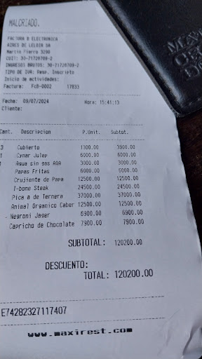 Read moreFuimos el feriado 9 de julio, tres personas sin reserva al mediodia, había mesas disponibles. Al sentarnos, nos trajeron una sopa de zapallo de cortesía por el frio, muy rica. Te cobran servicio de mesa ($1300 x persona). Pedimos un t-bone steak ($24500), una picaña de ternera de 1,100kg para compartir ($37000). La carne llegó en el punto solicitado. Para acompañar pedimos una porción de fritas ($6000) y una porción de crujientes de papas ($12500). Este último acompañamiento consistía en papas fritas, huevo frito, chorizo, pimientos asados y pimenton español, al llegar a la mesa vino sin pimientos y sin pimentón, al reclamar, se lleva el plato la moza y le tira dos rodajas de pimientos y sigue faltando el pimenton. Para tomar pedimos agua sin gas ($3000), un vino animal orgánico cabernet ($12500) y dos tragos (cynar julep $6000 no tenía casi alcohol y negroni jager $6900 estaba excelente). De postre pedimos un capricho de chocolate ($7900) , venía una bochita de helado de limon con mouse de chocolate, delicioso. La atención excelente, muy atenta la mosa en todo momento. Las porciones son normales, pero excesivos los precios ya que la comida no se destaca entre otros restaurantes. Si debo criticar, al momento de querer ir al baño, no tenían ninguno en planta baja (tengo un problema de salud y no puedo subir escaleras), me mandaron fuera del restaurante a un baño que esta dentro del paseo donde están todos los locales. Y lo segundo a criticar es que no podías estar sentada del frío que hacía en el lugar, todas las personas se quejaban de los mismo, y no se sacaban las camperas, no habia calefaccion estando...