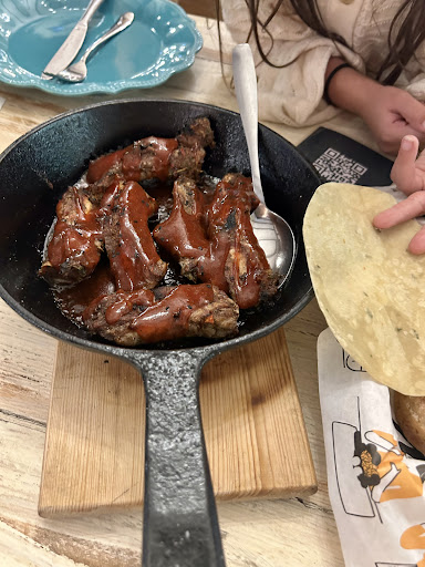 Indoors clean rustic decor, lovely tiled floor, olde world charm. Food was really delicious. We ordered pork ribs (bbq flavour), perfect. Kids messy and happy! We ordered baked potato , very good esp the sauces with it. The cheese & local mushroom skillet was aromatic. The clayoit with lamb and dried yoghurt /wild mint was delicious, a bit too rich , the lamb was succulent. The chicken khorovatz (bilberry sauce) had a delicious sauce with its bread& tarragon, chicken was a little dry. Wine was perfect , by the glass. Both red & white.