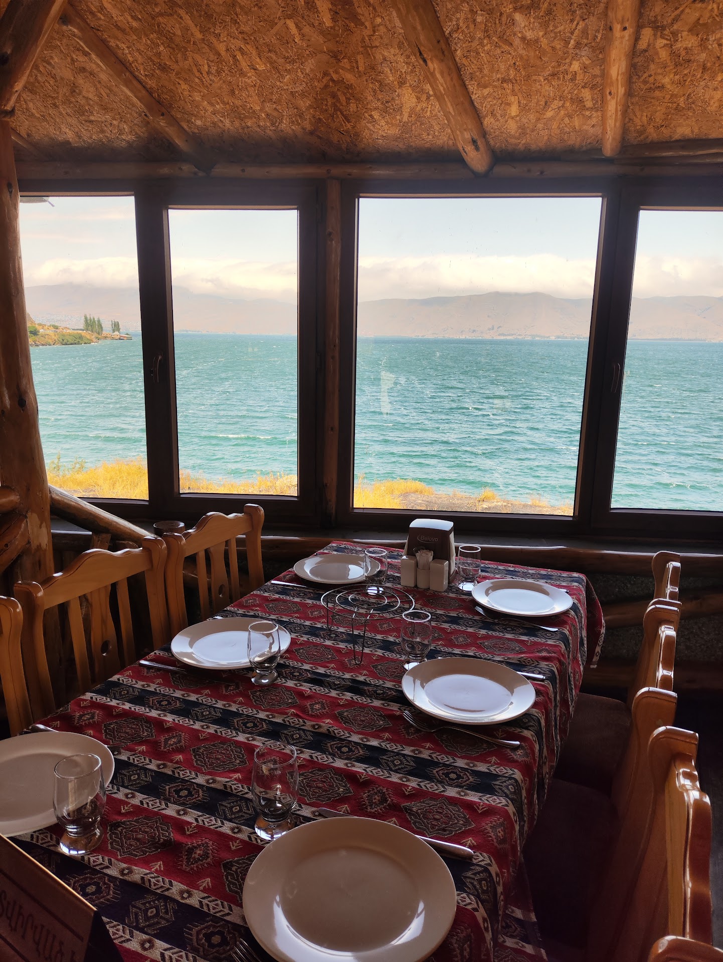 El restaurante es muy bonito, tiene una zona exterior con columpios de madera. El salón interior de madera es precioso, tiene vistas al lago Sevan. El camarero ha sido muy amable y respetuoso. Hemos pedido un plato de pescado de 1500 drams y un plato de pasta con ternera y caldo por 1800 drams. Hemos pagado en total 4390 drams con dos botellas de agua y el servicio incluido. Los platos son deliciosos. Merece la pena ir a este restaurante que está un poco alejado de...