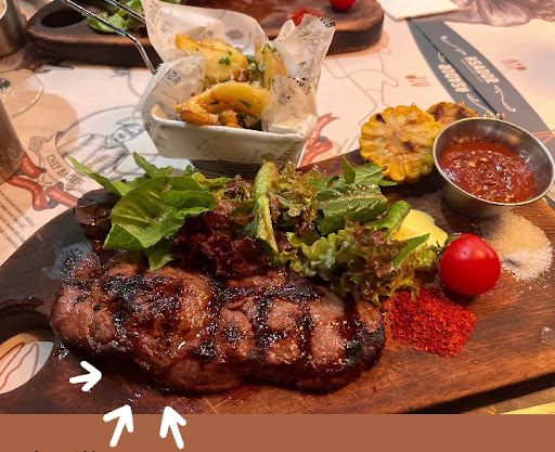 Read moreПарень сделал мне предложение, и мы выбрали это заведение, чтобы отметить радостное для нас событие. Встретили нас вроде хорошо. Мы заказали стейки, прожарки medium rare, но кажется было просто rare, но в любом случае мясо было ужасным, жестким, слишком долго его надо было жевать, хотя мы попросили официанта порекомендовать самое нежное/мягкое мясо. Я не стала доедать стейк, потому что ну невозможно столько жевать. заказала коктейль, не помню названия, чисто теоретически он должен был быть кисленьким, но никакой кислинки, только горечь. Нету полноценного барного меню, лишь меню с парой коктейлей, а 10 минут лясы точить с официантом пытаясь выбрать другой напиток, я такое не люблю, предпочитаю выбирать по данному меню. При заказе воды, приносят мелкую бутылку 0.3 и вода не Бюрех😒 единственное что было вкусным это криветки в соусе динамит. Хоть их соус и не оченб похож на динамит, но хотя бы вкусно. Попробовала там устрицу впервые(продаются поштучно 2к драм). Ну хотя бы не отравилась, и на том спасибо. По вкусу как какая-то сырая рыба, но не помню какая) Официант в начале позволил себе обратиться к нам на ТЫ. А когда убирал со стола, уронил на меня грязную вилку, а я была в белом сарафане. Ну он попытался посыпать солью, принести салфетки влажные, извинился тд. Ну кароче, пойти туда было плохим решением) к слову в ресторане Будда холл(который к сожалению закрылся) быди прекрасные стейки нежнейшие в той же прожарке, так что дело не в прожарке, а в качестве мяса. Ну крч, никому не советую никому...