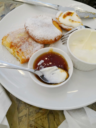 Loved the cottage cheese pancakes. Small but they had a doughnut like texture..... crispy on the outside and soft inside. It went very well with the cream and apricot jam.