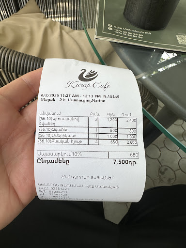 Read more⭐️⭐️⭐️⭐️⭐️ I give Karap Café a full 5 stars — not only for the friendly and respectful staff 🙏, but also for the stunning poolside view 🌊 that creates such a relaxing vibe. The food 🍽️ and drinks 🍹 were absolutely delicious and well-presented. A perfect spot to unwind near Circular Park 🌳 in the heart of Yerevan. Highly recommended for great service, peaceful atmosphere, and...