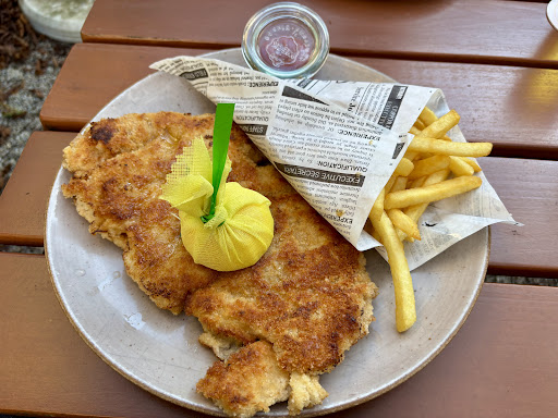 Das Essen war ein absoluter Genuss! Das Schnitzel war perfekt zubereitet – außen goldbraun und knusprig, innen zart und saftig. Dazu kamen frisch frittierte Pommes, die herrlich knusprig waren und nicht im Fett triefen. Besonders schön fand ich die kleine Zitronenverpackung, die das Gericht optisch und geschmacklich noch einmal aufwertet. Auch die Präsentation auf dem Teller, mit dem stilvoll verpackten Zeitungs-Papier für die Pommes, war modern und ansprechend. Hier stimmt einfach alles: Qualität, Geschmack und Liebe zum Detail. Absolut empfehlenswert – ich komme garantiert wieder!