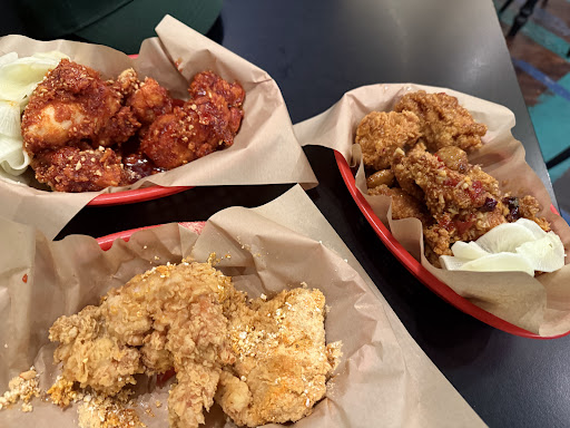 Me see chicken. Me bite. Crunch thunder. Juice rain. Brain happy. Spicy basket slaps. Sweet heat, sticky as a servo floor at 2 am, nutty crunch on top. Cheesy dust basket tastes like snow made of Twisties. Wild. Pickled radish resets the tongue. Sip of water. Back in the ring.
