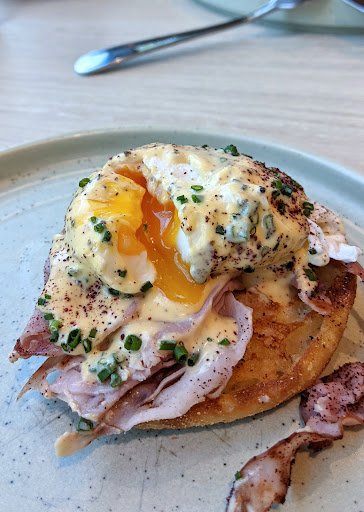 Read moreLight-filled space, busy yet chill vibe. Limited but more than adequate menu selection. You order from an electronic tablet at your table, which is nice as you get pictures of the items and can keep an eye on the tab as you go out of control in your orders 🤭. We shared eggs benedict and the single sweet item - waffles, which was more than enough for brunch (we're small eaters though). Everything we had was very good..it struck us that even standard items like eggs Benny can be a new revelation when well. Shout out to the affogato. This is the only place I've been that serves it with TWO generous scoops of ice cream. Because the coffee is so fragrant and on the sour side, it takes the combination with vanilla ice cream to a whole new level. Perfect coffee to ice cream ratio. Service is friendly and prompt. Definitely a serious contender for "our local"...