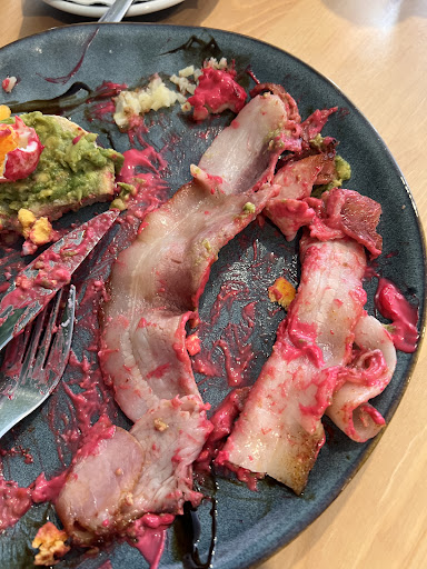 As soon as this happened I spoke to the staff and they took away my plate. After they returned, the brought back the same food but with replaced eggs. At this point the Hash Brown I had paid for was cold, as well as the hollandaise sauce and muffins. After accepting the state of the meal (being cold) I decided to just eat it because my 9 month old was hungry and waiting to share my meal with her. After cutting into the bacon I soon discovered that a majority of the bacon was uncooked and completely white. It was folded in a way that some parts were cooked, but a majority of the fatty bits were unexposed to the pan and completely uncooked. I took a photo of this if you want to see it.