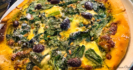 For our main, we chose the Spinaci pizza. It arrived at the perfect moment—visually striking and generously topped with garlicky marinated spinach, lightly toasted pine nuts, and a rhythmic scattering of kalamata olives. Each bite was layered, aromatic, and utterly compelling.