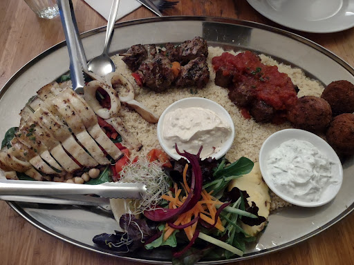 Just eat the whitebait as it is – whole and straight into your mouth. Scrumptious! Octopus (expensive!) and not quite as Greek-grilled as you might expect but unquestionably succulent. The beetroot salad was a highlight. It all comes on a couscous based platter plus an accompanying dip of a potato-garlic-based skordhaliá.