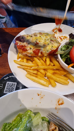 I asked for no cheese on mine and they scraped it off and left cheese and a dent on the top. The parmy was a good size but had two slices of slapped on store ham, nothing special. The salsa is something I would guess came from a can with flat leaf parsley dropped on top and not appealing at all. Great Chips & a nice salad.