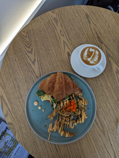 Coffee came first before food. I loved the latte art on top of the flat white, an adorable swan which was creative of the owner. It was nice and strong, hands down the best coffee I have had in Adelaide! I ordered the fried soft shell crab croissant with scrambled eggs and salad inside. Wow - it was absolutely mind-blowing! The croissant was so so crispy and flaky that every bite I had was so messy but so good at the same time! I loved how they toasted the croissant before serving to maintain that flakiness, really amazing texture! The soft shell crab with the sriracha mayo was top-notch, went so well together and was flavourful. The scrambled eggs inside were smooth and fluffy, just a fantastic dish all around!