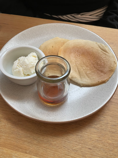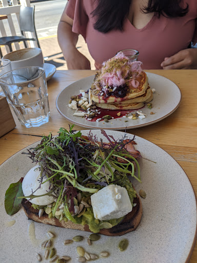 Just under 35 minutes went and we were served our brunch, I had a smashed avo and she had the pancakes. Immaculately presented and tasted great. The pancakes needed something creamy to cut All the tartness of the berries, and my smashed avo needed lemon or an extra wedge, and toast was burnt... Not the best. The poached egg was perfectly done...