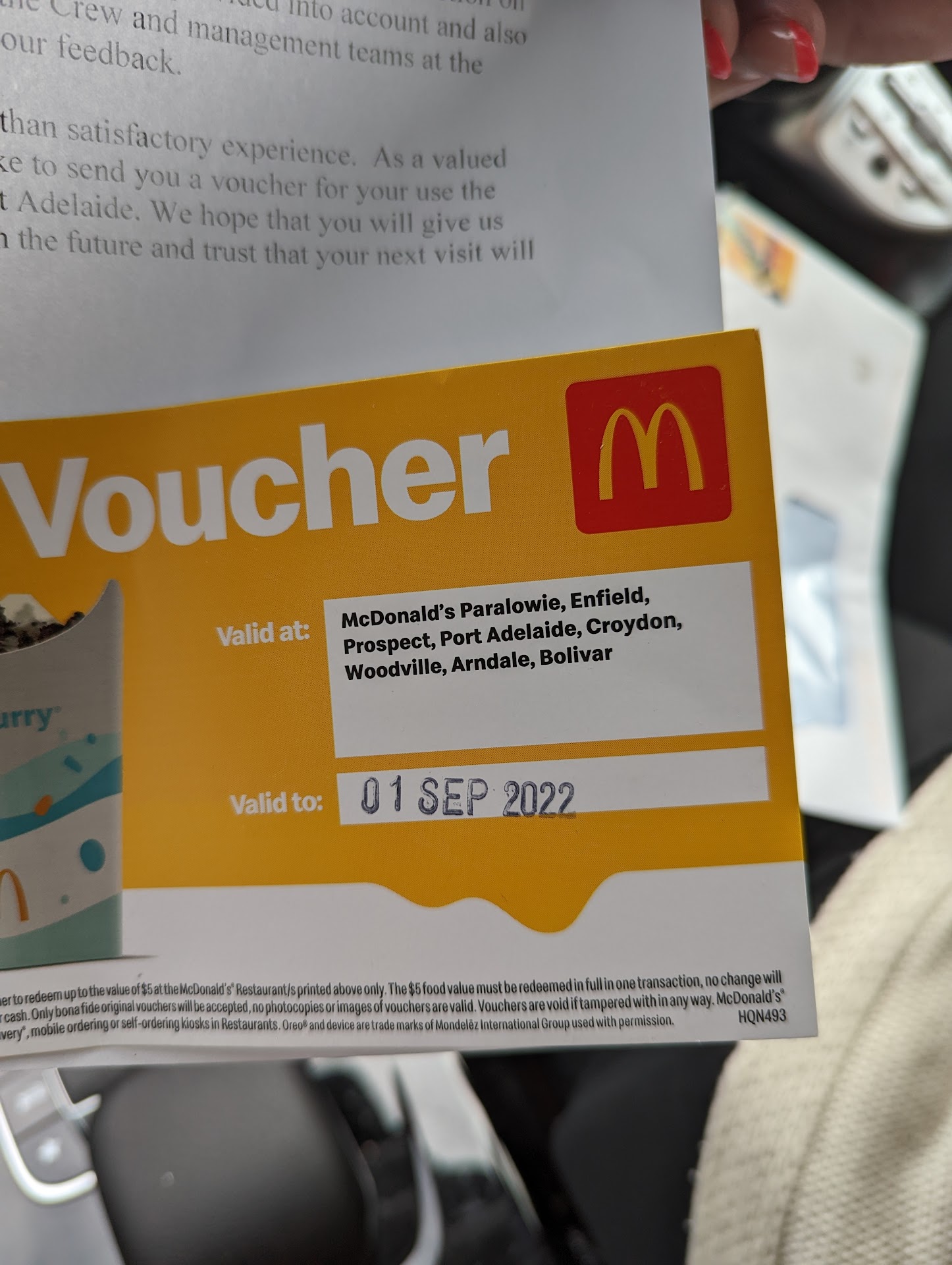 Read moreMost of the machines you order at were not working. We ordered a large meal with a Sunday and no cutlery or serviettes were given so had to go back to the counter to get them. They had a "monopoly" promotion on at the time and they didn't have any large chip packs which would have 2 game chances but we got a medium pack with 1 game chance with a small pack we were not offered an extra chance. Noticed another customer come back into the store and returned some items and got a cash refund. Rubbish was not collected from tables like most McDonald's restaurants. The cafe section had nothing on display. The time before that we visited this store we got take away breakfast and when we got home there was items missing we called up the store and they promised to send out some vouchers which they never did. I just wanted to update my review today is the 27/9/2022 and we finally got the voucher we were promised from McDonald's Port Adelaide after we complained over a month ago the best part is that the voucher expired on 01/9/2022 so it expired not only 26 days before we got it but also before it was posted. We took it back to the store and asked to speak with the manager who was a bit disinterested and went away and came back and said he can't find something so just gave us...