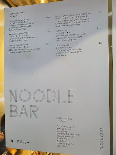 Went again updated - better but still there are places with better value TLDR save your money and go to hajime. Where to start, nice decor, good location. Started with the sides, the gyoza was really tasty, interesting flavour and nice combo with the sauce that came with it. The karaage was good but tasted like home made karaage I.e. Soft mild taste (not that I have an issue with the sides but isn't it too expensive for $10). The first thing that went wrong was the table water, I don't mind getting table water and glasses myself, but I do care about what I'm drinking from, paper cups is ridiculous. Not only is this wasteful, but is low quality and not enhancing the experience. The other issue I have is that they didn't even bring out side plates for my partner and I to share the sides, the gyoza is oily, either you are going to get it on yourself or spill it on the table. Their solution, have a napkin, which is your plate, the utensil you will use to clean the table as your going to make a mess, and the thing you are going to use to clean your mouth later, I don't think that is very sanitary. If I am spending $10 dollars per side and $20+ on mains, I expect a bit more than paper cups and napkins as plates. Then came the mains, these were a good size, however the bases were watery and oily, the noodles were rubbery, and the chashu was lacklustre. The ajitama was nice but could've been more raw (personal preference). You would think a ramen bar that has a limited menu should do what they have on the menu really well... However this is not the case. Still edible but would I come here again out of choice, probably not. There are better ramen bars in town at a better price point. If you want something that breaks tradition, come here as it has truffle ramen and...