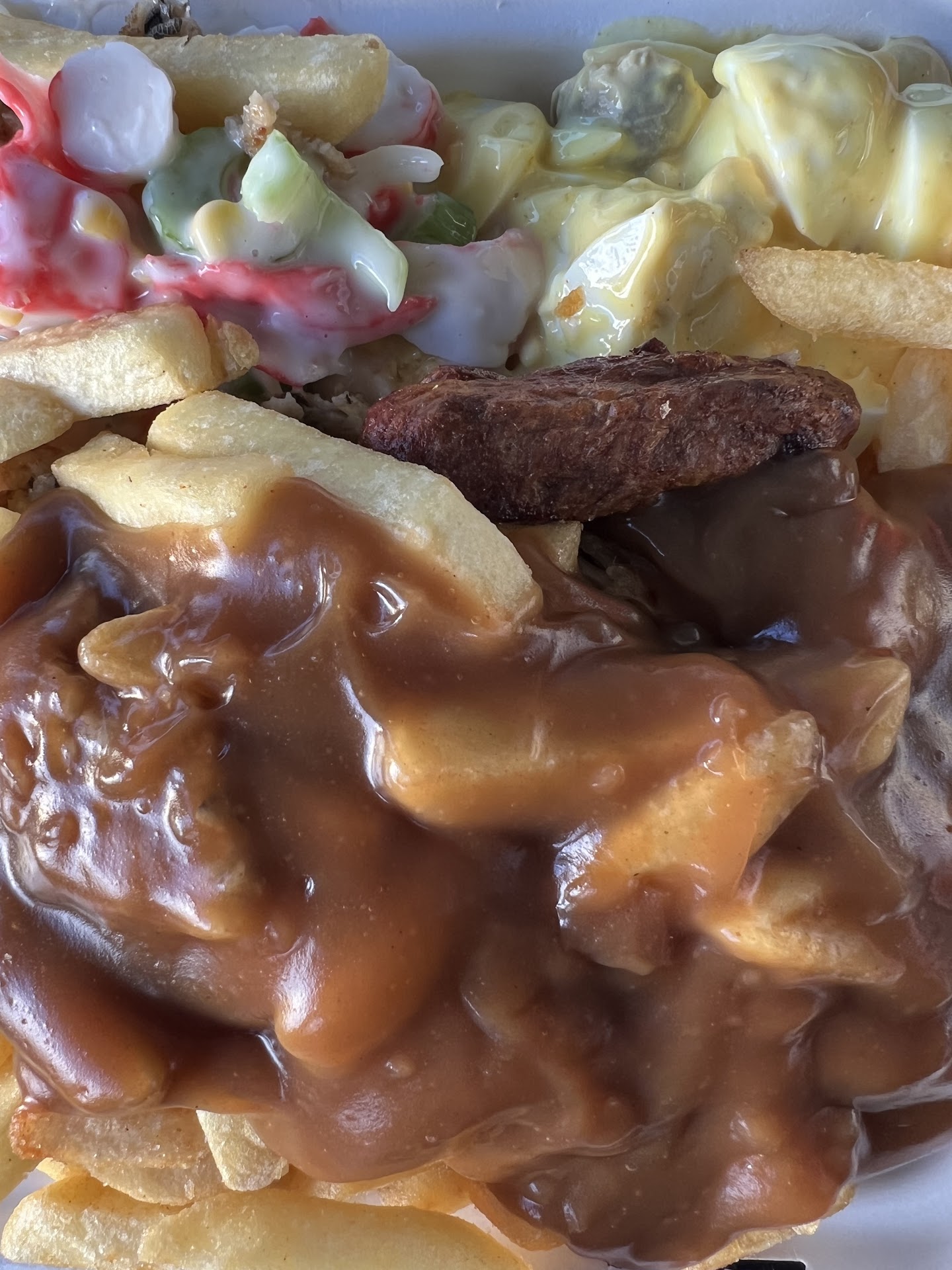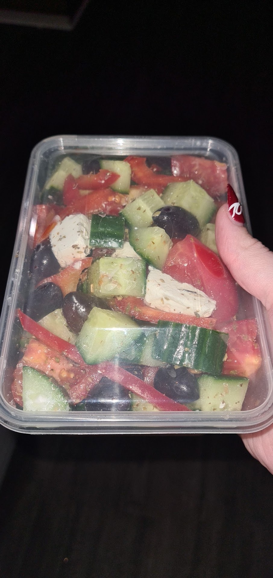 Greek salad was very weird too. They used olives with seeds in them, probably to cut costs. Never had a Greek salad where they use olives with seeds in them. The flavour wasn't right either, I don't know what herbs were used but something was weird about it.