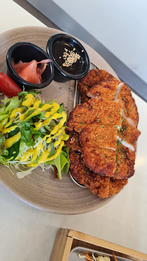 The restaurant is exceptionally clean and well laid out. Staff greet you when you enter and direct you to a table. Menus are well laid out and easy to navigate with plenty of options and variety. Our friends selected individual dishes, one opted for an entree plate of various small bites and was given the option of changing out items she didn’t want for those she preferred, our other friend opted for a regular serve of hot and spicy (described at very hot on the menu) boneless chicken served with cabbage salad, hubby and I ordered a half and half boneless chicken platter that serves 2-3. Our half and half option consisted of half original chicken and half soy marinated chicken. This was also served with cabbage salad, nicely presented with a dressing and mayonnaise topping. We all had bottled drinks, one of our friend opted for a Coopers Ale, which he was grateful for to help temper the heat in the hot and spicy chicken, which he enjoyed very much. We all thoroughly enjoyed our meals and the large share platter hubby and I had could have easily served three,or four if we had maybe had a small entree. We will definitely return. This place is now on our...
