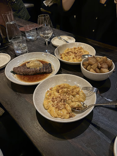 Yesterday night me and my girlfriend went to have a dinner for our first Valentine’s Day together. It was our first time visiting and we were having the set valentine's day menu. They put us on the first table of the inside area, close to the door which gave access to the street. We got served by a waitresses, she was really nice , the manager also gave us a greeting. They started with the entree, very yummy, then came a ragu pasta also very good. Then came our favourite dish the steak loin with butter on top, potatoes and salad, we were having a beautiful night.