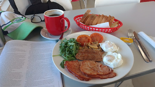 Have been driving past this place forever and have always wanted to stop in. I shouldn't have bothered. The decor was very dated and bland. The young girl serving us was clueless and had to keep asking other staff questions. I asked for their chicken and avo baguette menu item which was sposed to have tomato, cheese and mayo aswell as the chicken and avo, all I got was chicken and avo, which was not fresh but from a commercial squeezy tube. And it was not a baguette as advertised in the menu but just a plain bread roll. My friend opted for the vegetarian quiche which took forever for them to heat up, honestly I think they forgot because I had to ask what was happening with her order as we sat and waited, and waited, and waited. I was shocked to see as I walked in, the baked offerings just sitting on the counter out in the open not covered at all. The only reason I gave 3 stars for the food was because the quiche...