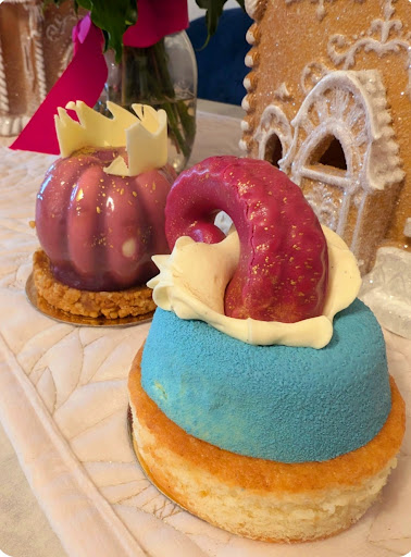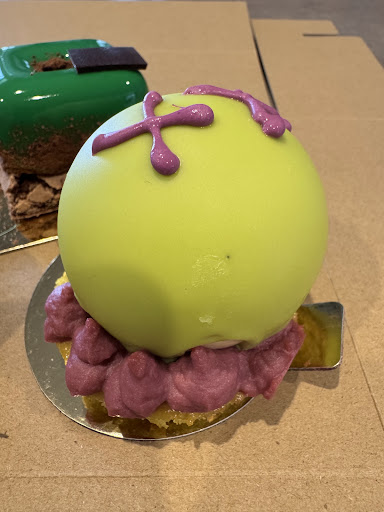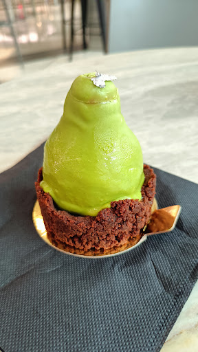 The "Perfect Pair" looked a treat. Once I broke through the green surface of the pear it revealed a chocolate mousse with pear compote inside all of this deliciousness sitting on a chocolate biscuit base. I thought all the flavours worked really well. I liked how it really resembled a pair. Overall it was great, it wasn't too sweet but just enough. One down side - the box. The pear was about 1mm too high for the box with some of the silver leaf decoration was stuck to the top.