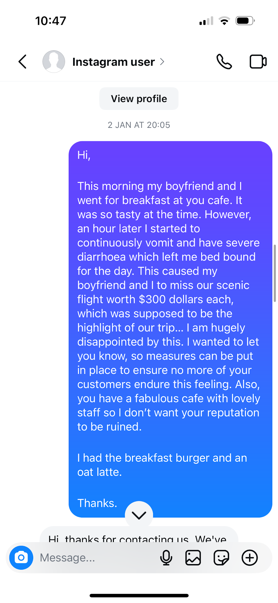 Just responding to you reply. I never said I started feeling sick 30 minutes later? I started to feel unwell roughly 1-2 hours later if you go back and read my review. Also, I started to feel myself again at 8pm, Iām sure a gastro virus lasts longer than this ? Very unusual that I could have picked up a gastro virus in the area when i walked straight from the bus to your cafe and nobody else in our group got it? Iāve just attached our chat to show how helpful you were in the beginning and to prove that I never demanded a refund or to pay for my scenic flight as it had been rescheduled for us...