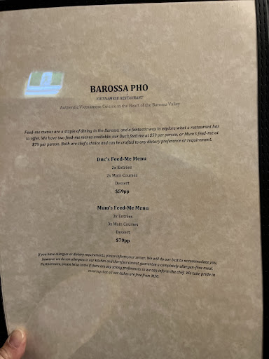 Read moreWe were so glad we decided to visit Barossa Pho for our only evening meal in the Barossa, as anything after it would have been a disappointment. We ordered the Feed me menu and every dish was absolutely delicious and we thoroughly enjoyed the range of dishes. Both the manager and the owner were extremely welcoming and I was even invited into the kitchen to view the pho master stock as it simmered its way to perfection. Just when we thought we had come to the end of our delicious feast we were given a dreamy chocolate crÚme brûlée. Can totally understand why they have such a high rating. I wish we lived closer but an 18 hour drive is just a bit too much, even for one of their...