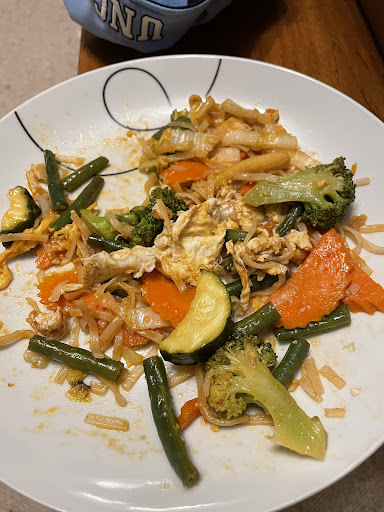 Pad Thai (see photo) had zero pad thai flavour (instead had a very strange tang that had a bad aftertaste) - no peanut flavour, no lemon. Frozen vegetables (still half frozen and definitely raw) featuring large chunks of zuccini, carrot and broccoli - almost certainly straight from a bag of mixed veggies.