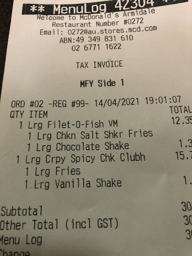 Read moreI don’t usually go to Armidale maccas but after tonight’s experience, will NEVER try it again!Ordered dinner online through Menulog. First, the delivery time was 15-20 minutes, after finalizing the order it changed to an hour. I called the store after the expected delivery time and they said I have to wait another 20 minutes, because they only had 1 delivery car. It took 1:30 hours to finally get the food ( which was pretty much soggy and cold by then). An additional disappointment was that the order was missing some items ( 2 shakes and one large fries!) apparently they decided to send me a coke instead of these three items! Armidale maccas is not an option for me any more. But you can’t keep disappointing your customers like this. The management needs...