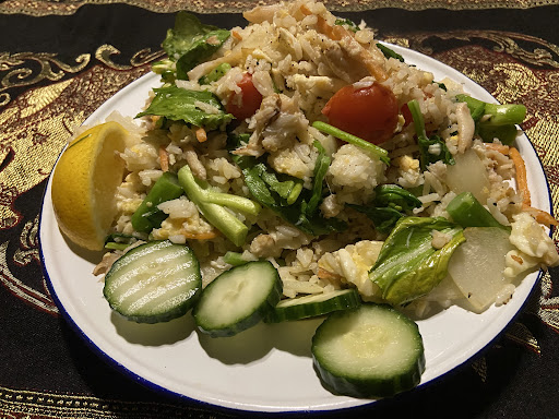 We approached the bar, where a grumpy-looking fellow stood staring at us. When we got to him, he promptly told us "no take away". Ok... not the best greeting, but after telling him we planned to eat in we took a menu and sat down. After looking over the menu (which was just a quickly thrown together page on Microsoft Word - could really use a re-design), we returned to the bar to order. We wanted one dish to be vegetarian so we asked if that instead of meat (almost all items included meat), we could have extra vegetables. The man sighed and lazily walked over to the kitchen window. He returned and told us it would be $2 extra. Two dollars extra for no meat, which is expensive, and extra vegetables, which is cheap. Interesting. We asked him if that was correct, as it didn't seem to make sense to pay more for no meat.. again he sighed and just really didn't seem to care at all.
